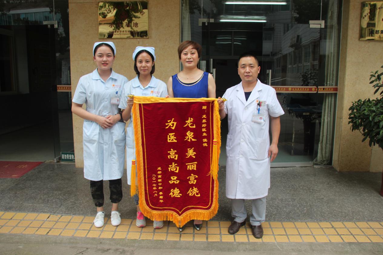 2017年9月29日,家住华阳的李女士一早将一面锦旗送到了成都黄再军医院内一科主任饶德医师的手中,向饶德医师表达了最真诚的谢意。