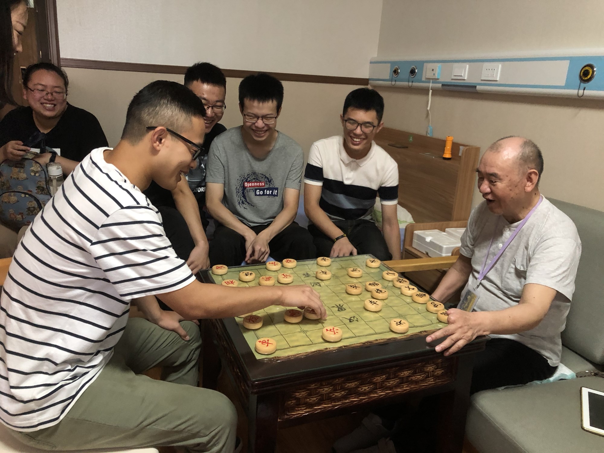当我们在走廊上就远远的就听见爽朗的笑声和阵阵掌声。原来今天也是邓爷爷(邓小久)的生日,得知这一消息后,志愿者一起为爷爷唱起了生日歌,送上了祝福。悉知邓爷爷是下棋高手时,一定要陪爷爷对上一局,讨教爷爷的下棋技术,让爷爷过上一个有意义而温馨的生日,感到阳光雅韵人文情怀。