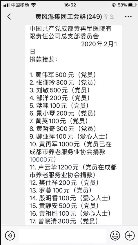 2月1日,成都黄再军医院有限责任公司党总支致全体职工及爱心人士倡议书 发出后,黄风湿集团全员上下迅速行动,党员干部首当其冲,号召全体职员工积极为武汉疫情募捐,反响热烈。