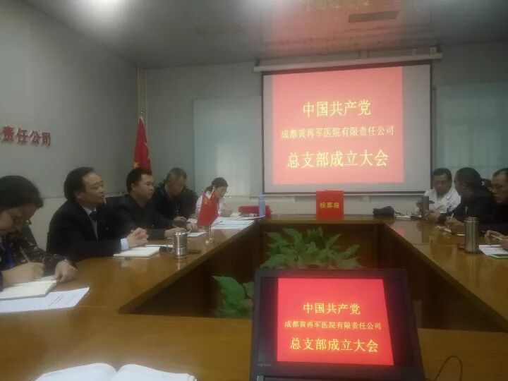 会上, 曾建良同志宣布了龙泉驿区同安街道党工委《关于成都黄再军医院有限责任公司党总支部成立的批复》内容;黄再军同志向大会做了公司党支部成立以来的工作报告;张谢玲同志作党总支部筹备工作报告;万红光同志宣读大会选举办法,通过了监票人和计票人名单;陈益民同志向大会宣布了党总支部委员候选人名单及简要情况。随后,大会选举投票工作正式开始。在监票人等3名工作人员的组织和全体党员的监督下,公司每位党员认真、慎重地填写好手中的选票并向投票箱中投入了庄严的一票,整个投票过程在严肃有序的气氛中顺利进行。严格按选举程序产生了成都黄再军医院有限责任公司第一届党总支部委员名单,他们分别是黄再军、万红光、景小琴、崔晋锋、张谢玲5位同志。黄再军同志作为当选党总支部委员的代表发言,表示在今后的工作中,党总支委员将会更加紧密团结全体党员,认真履行职责,兢兢业业工作,决不辜负上级党委和全体党员的信任和重托。同时完成了公司机关党支部、成都黄再军医院党支部、成都再军爱心护理院党支部委员的选举,董事长黄再军当选为公司党总支部书记。
