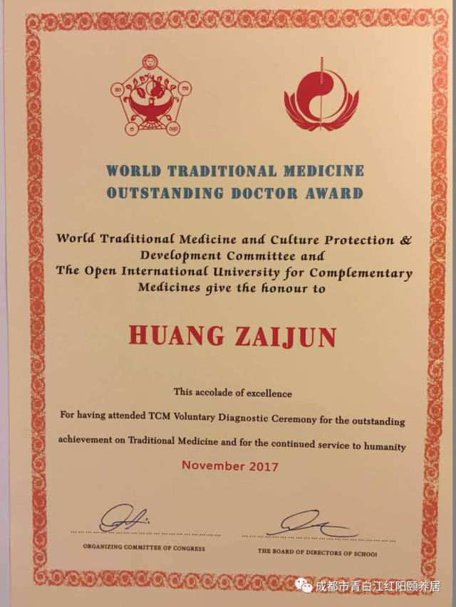 鉴于黄再军董事长在传统医学领域所做出的贡献,特别是在治疗风湿、类风湿、肌无力、肌萎缩等世界疑难病方面提出的学术观点——“脾胃为后天之母,肾为先天之本”,深受评委好评,同时其自创的黄风湿系列疗法在风湿免疫领域所取得的成绩,以及诸多发明、专利、系列产品,被大会授予“世界传统医学杰出名医奖”,其发明的活血止痛冷敷贴效果显著被授予“世界传统医学优秀成果奖”。斯里兰卡医学大学鉴于他在医学方面的贡献,授予了黄再军董事长斯里兰卡医学大学博士称号。