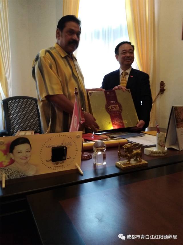 第55届世界传统医学大会于当地时间11月27日下午4时正式开幕。大会开幕前,斯里兰卡政要、皇室代表接见了中国与会代表。黄再军董事长受到了斯里兰卡前总统马欣达·贾帕克萨先生亲切接见,并就怎样在“一带一路”引领下融合世界传统医学,把中医中药走向世界进行了深入交流。同时为了感谢总统先生为传统医学作出的贡献,黄再军董事长向马欣达·贾帕克萨先生赠送了黄风湿系列产品。